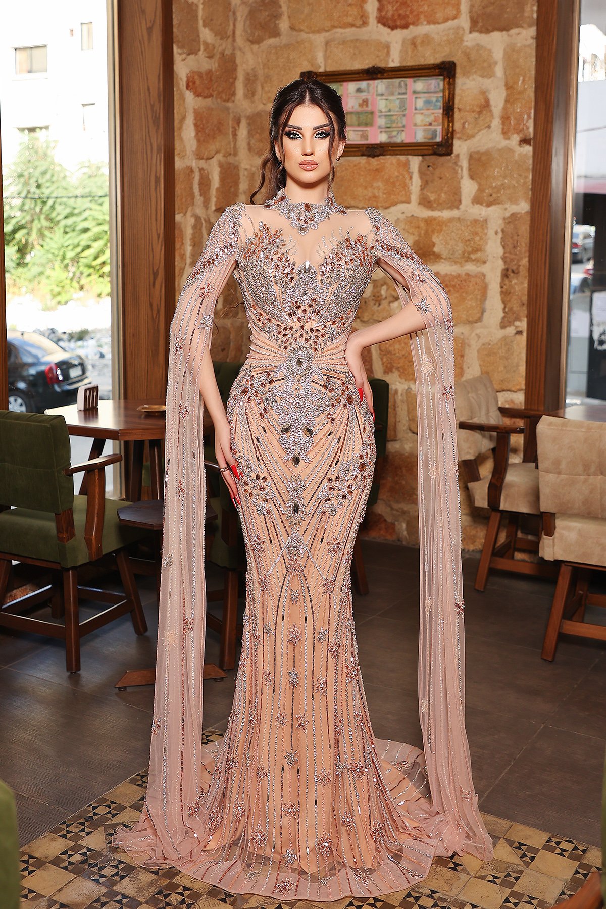 This gown is a masterpiece of elegant design and luxury. It features a sleek, body-hugging silhouette that accentuates the figure with grace. The upper part of the dress is adorned with intricate golden embroidery covering the entire surface, complemented by geometric cutouts that add a bold and modern touch. The shoulders are crafted from the same detailed goldwork, with a small feather embellishment on the right shoulder, adding a magical and unique flair. The flowing skirt has a wavy hemline that moves gracefully with every step. The warm golden hue exudes opulence and sophistication, making this dress perfect for special occasions